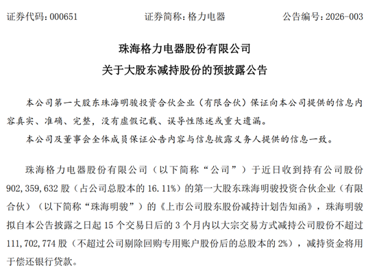 2月25日晚间,格力电器发布公告称,公司第一大股东珠海明骏拟自公告披露之日起15个交易日后的3个月内以大宗交易方式减持公司股份不超过111,702,774股(不超过公司剔除回购专用账户股份后的总股本的2%),减持资金将用于偿还银行贷款。