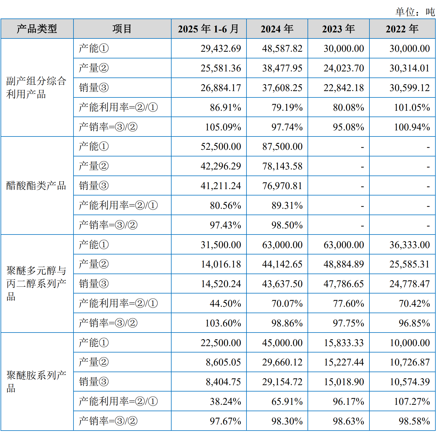报告期内,昌德科技对中石化采购占比居高不下,2022年74.18%、2023年75.64%、2024年高达82.05%,2025年上半年因湖南石化检修略降至69.27%。公司核心原材料环氧丙烷、己内酰胺副产物几乎全部来自中石化体系,且采用 “管道隔墙供应” 模式。这种模式看似降低运输成本,实则将生产命脉完全交给上游,意味着命运与中石化深度绑定。例如,2023年湖南石化搬迁,昌德科技被迫同步停产搬迁,直接导致2023-2024年业绩带来了不利影响,原岳阳生产基地于2023年下半年开始陆续停产。2025年4-6月湖南石化装置检修,昌德科技再次面临原料减供,只能临时寻找替代供应商,新材料业务产能利用率大幅下滑。