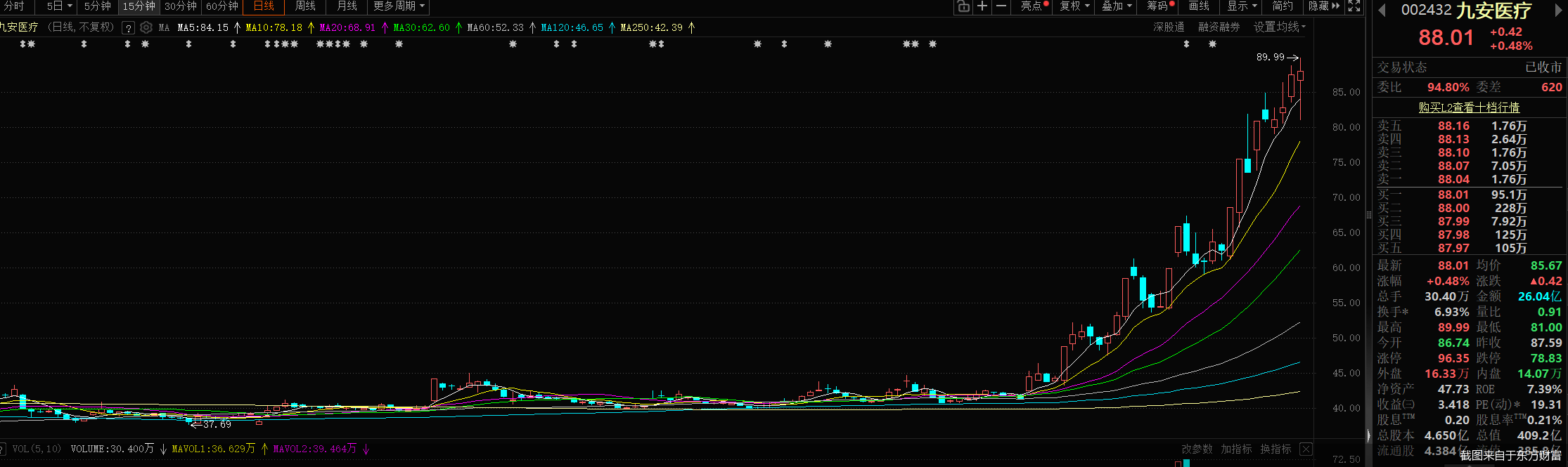 交易行情显示,4月9日,九安医疗收涨0.48%,收盘价为88.01元/股,全天成交金额为26.04亿元,总市值达到409.2亿元。盘中股价最高触及89.99元/股,系后复权形式下,2022年5月以来的股价新高。
