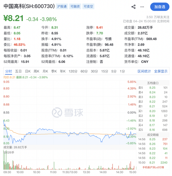截至4月24日收盘,中国高科股价报8.21元/股,总市值为48.16亿元。
