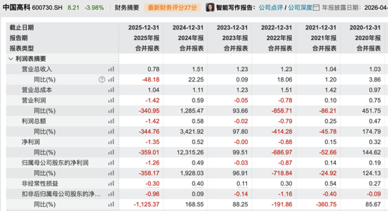 业绩方面,中国高科发布的2025年年报显示,公司全年实现营业收入7803.98万元,同比下滑48.18%;归母净利润为-1.26亿元,同比大幅下滑358.17%,业绩由盈转亏。