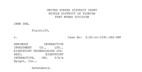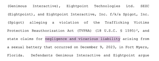 文书显示,原告Jane Doe于2025年11月提起诉讼,起诉Genimous Interactive Investment Co.,Ltd.(下称“Genimous Interactive”)、Eightpoint Technologies Ltd.SEZC(下称“Eightpoint”)以及Eightpoint Interactive,Inc.f/k/a Spigot,Inc.(下称“Spigot”),并就2023年12月9日发生在佛罗里达州迈尔斯堡的一起性侵犯案件(sexual battery)提出州法层面的过失责任(negligence)与替代责任(vicarious liability)主张。