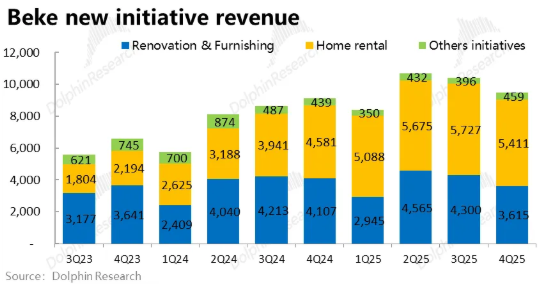 关键是,贝壳的新业务正在稳步成长。2025年,非房交易业务收入在总收入中的占比达到41%,其中,租房服务收入增长53%,实现盈利;家装家居业务贡献利润率提升至31.4%。